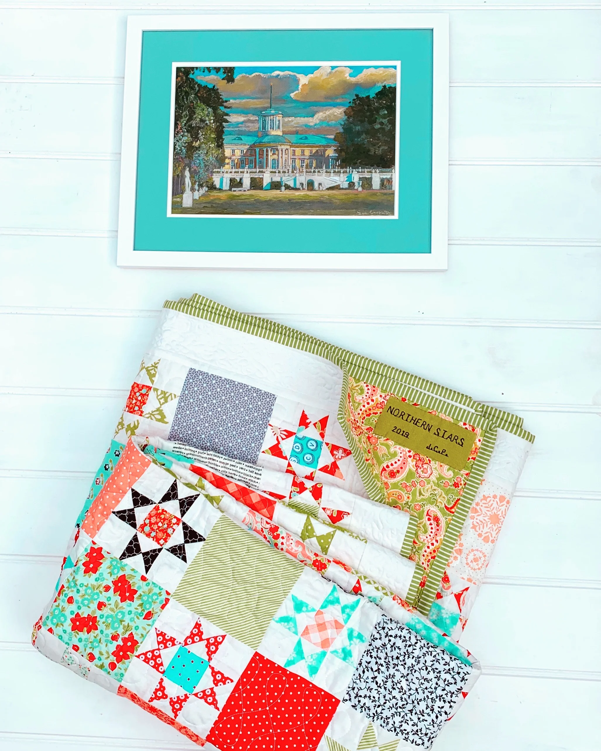 I actually finished it on the same day that I got a picture back from the framers and some how they seem to go together, so I named my quilt ‘Northern Stars’. The painting is of ‘Archangelskoye’ the Moscow home of Felix Yusspov (murderer of Rasputin). Even though it had been neglected for decades and was falling to bits, I loved going here during our posting in Moscow and wandering around the once grand and now abandoned gardens and I was thrilled when I got the chance to buy this little oil painting as a souvenir. It had a crappy frame on it and a month or so ago when I was having a bit of a reorganisation upstairs, I decided it needed a new lease of life and so it has….