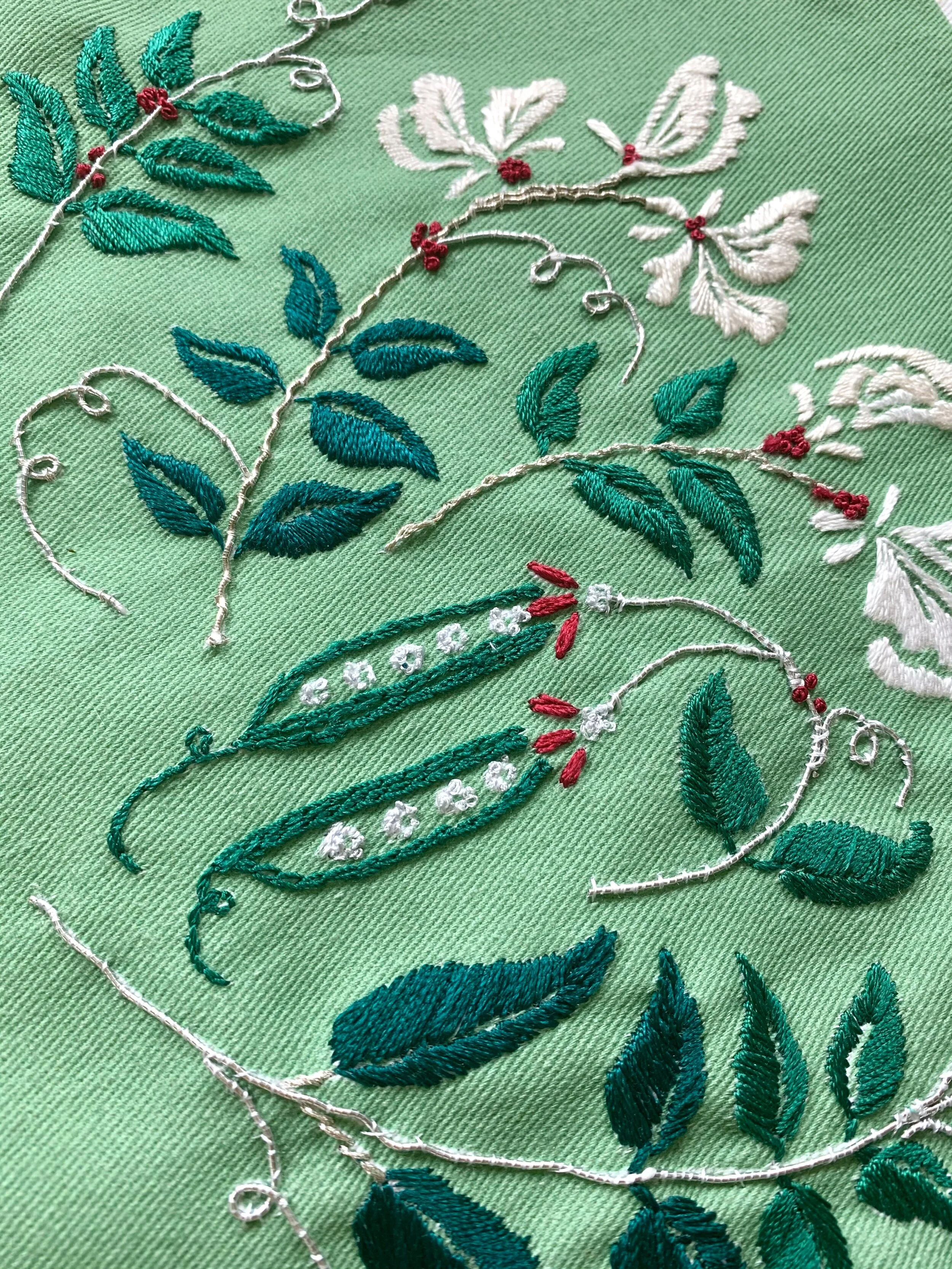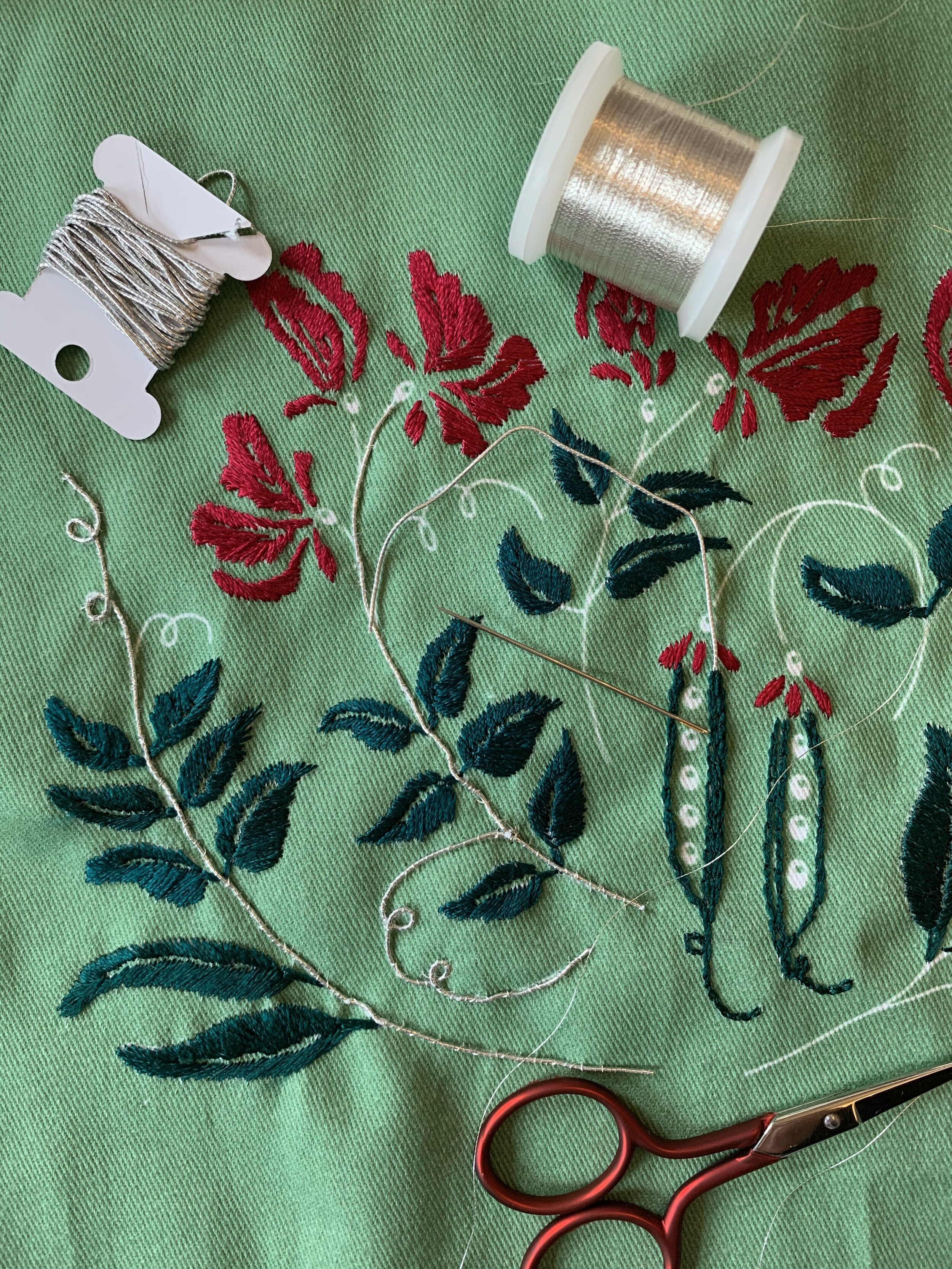 I had also bought a pack of assorted metal threads which I found completely fascinating and some of these were not the sort that you could thread in a needle and stitch with, but more the kind that you ‘couch’ - which means you lie it along the line you want to stitch and then use a fine thread to secure it in place. These seemed like they might work on a project like this and also be a bit of a statement, adding some sparkle and vibrance to the embroidery.