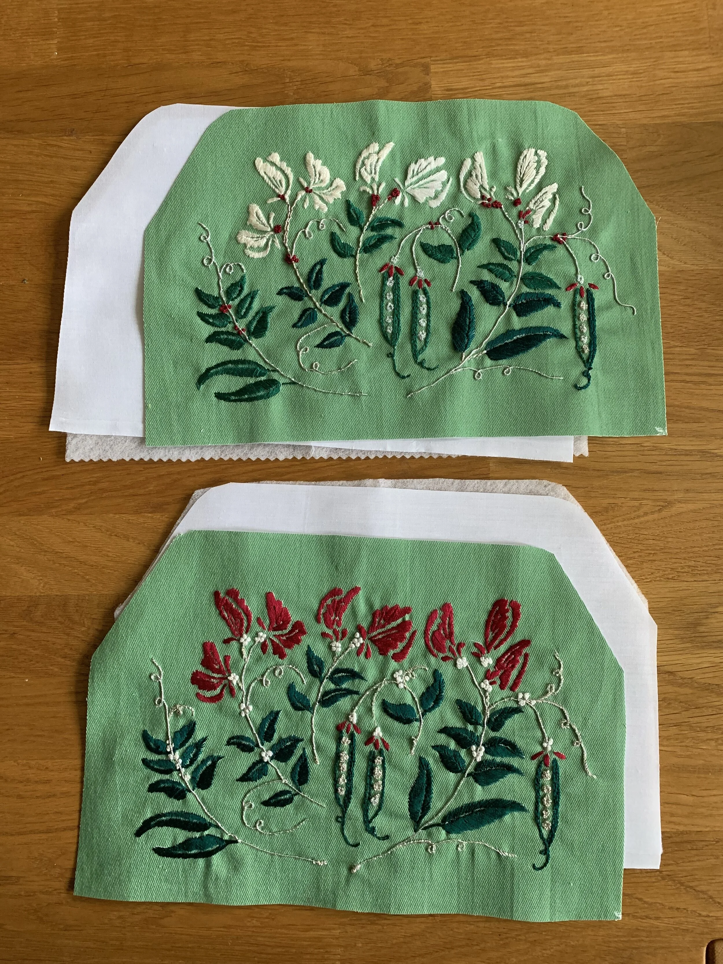 The overall effect was so lovely I was so thrilled and felt a real sense of accomplishment. I realised too how much fairly dense embroidery can be really beautiful - it is always easy to just make a stitch a small motif on something but this kind of larger piece is bringing the work to a whole other level. Once they were finished I confess I did feel a little apprehensive about constructing the purse. Cutting out was probably the worse bit. I used the printed template in the pattern and a pin to line up the design on the fabric. What you can see when it is cut is how much the floral embroidery will cover the clutch bag and how beautiful it will be.