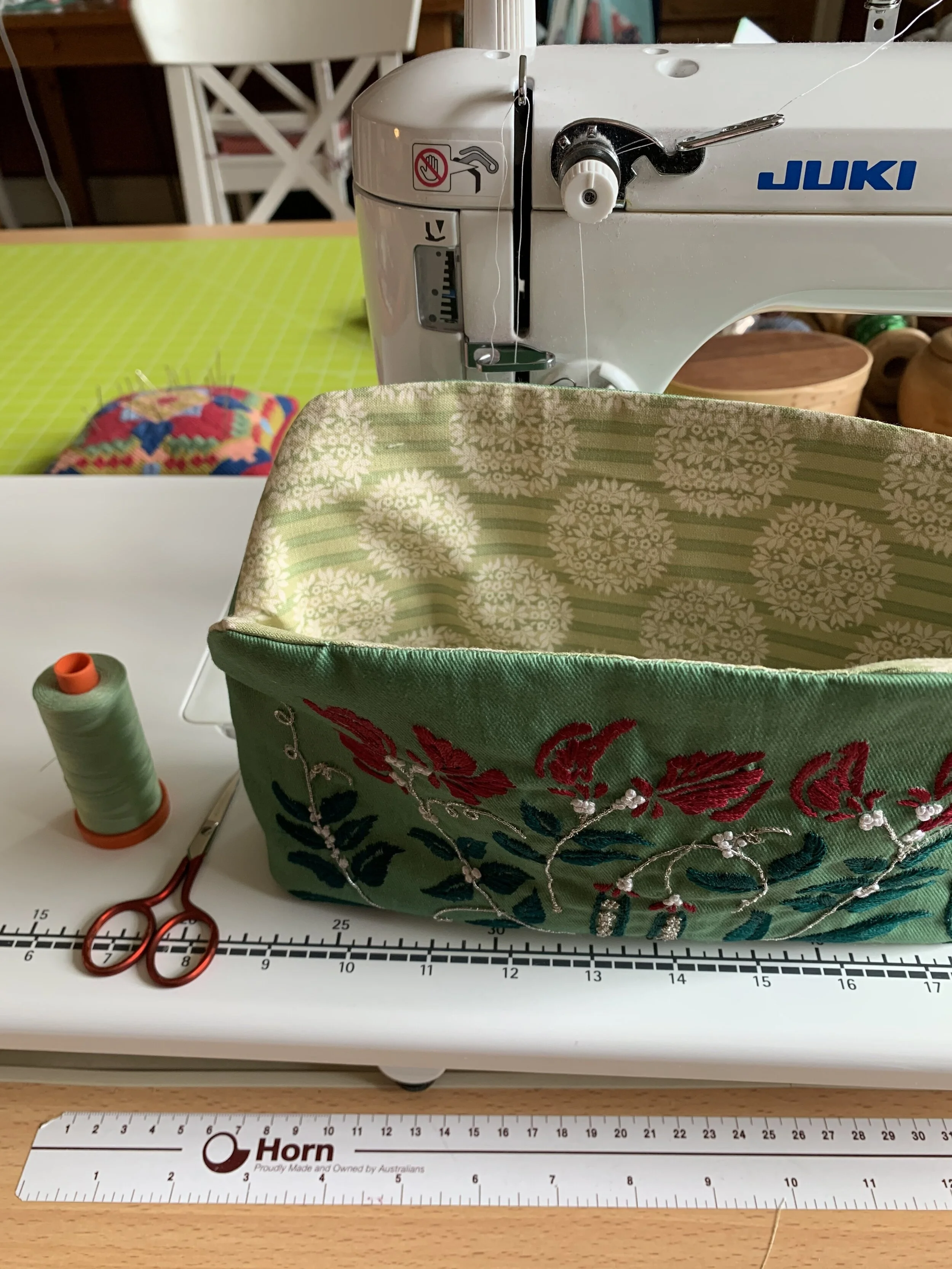 After I had got everything ready to assemble I did make a decision to change out the lining fabric that was in the kit. It was fine white cotton lawn and I thought it would probably show the dirt rather too much and so I used a piece of Tilda fabric from my stash which seemed to fit the bill. The instructions for putting it all together were clear and easy to follow and as soon as I had got it all turned through I was suddenly so excited. The embroidery really popped and filled the whole space of the bag exterior - it seemed really rather glamorous already!