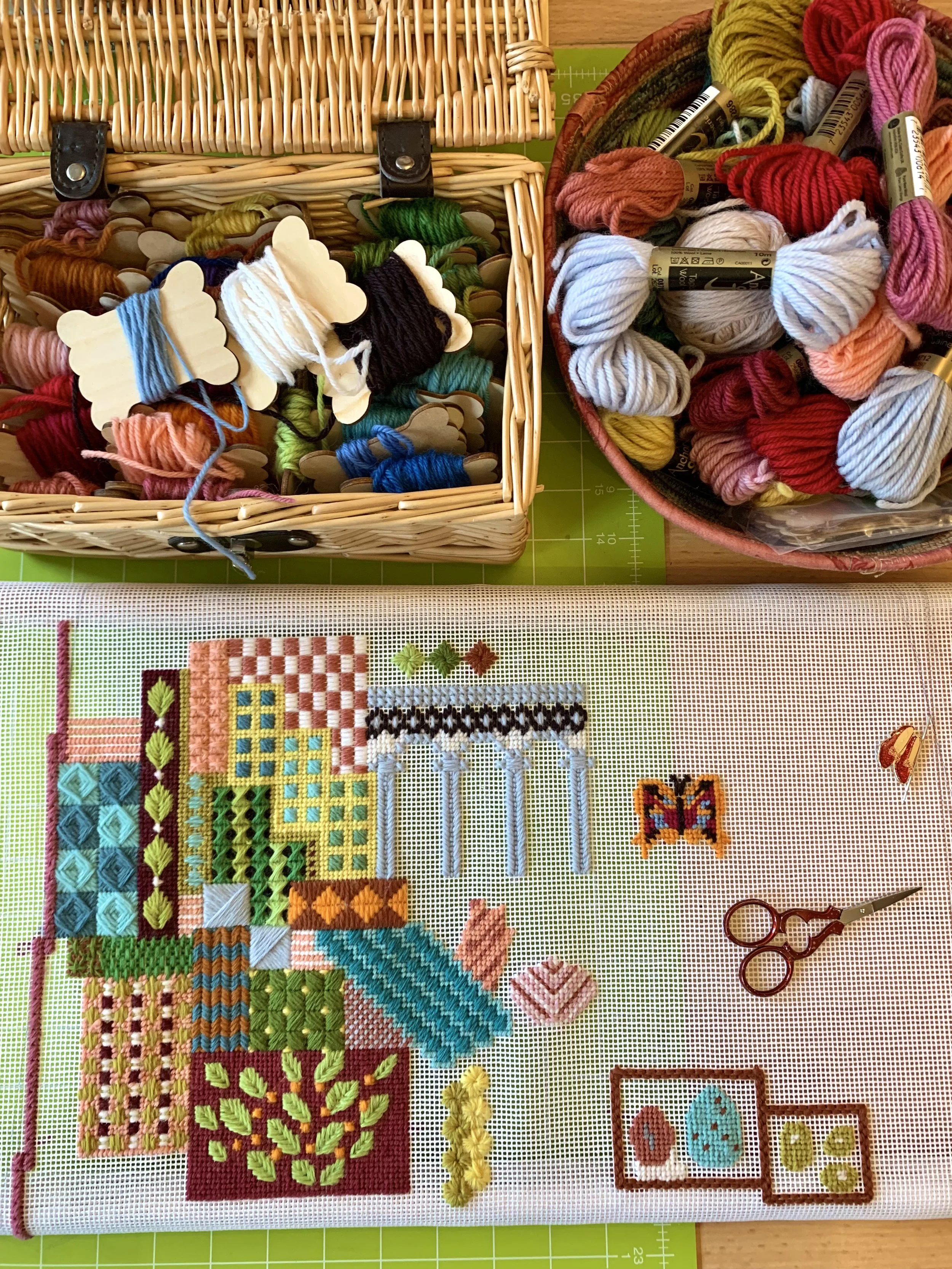 Also waiting to be finished is my needlepoint seat cover, inspired by a visit to the Natural History museum and this is a priority now. The canvas is filling up with lots of textures and motifs so I need to keep working at it.