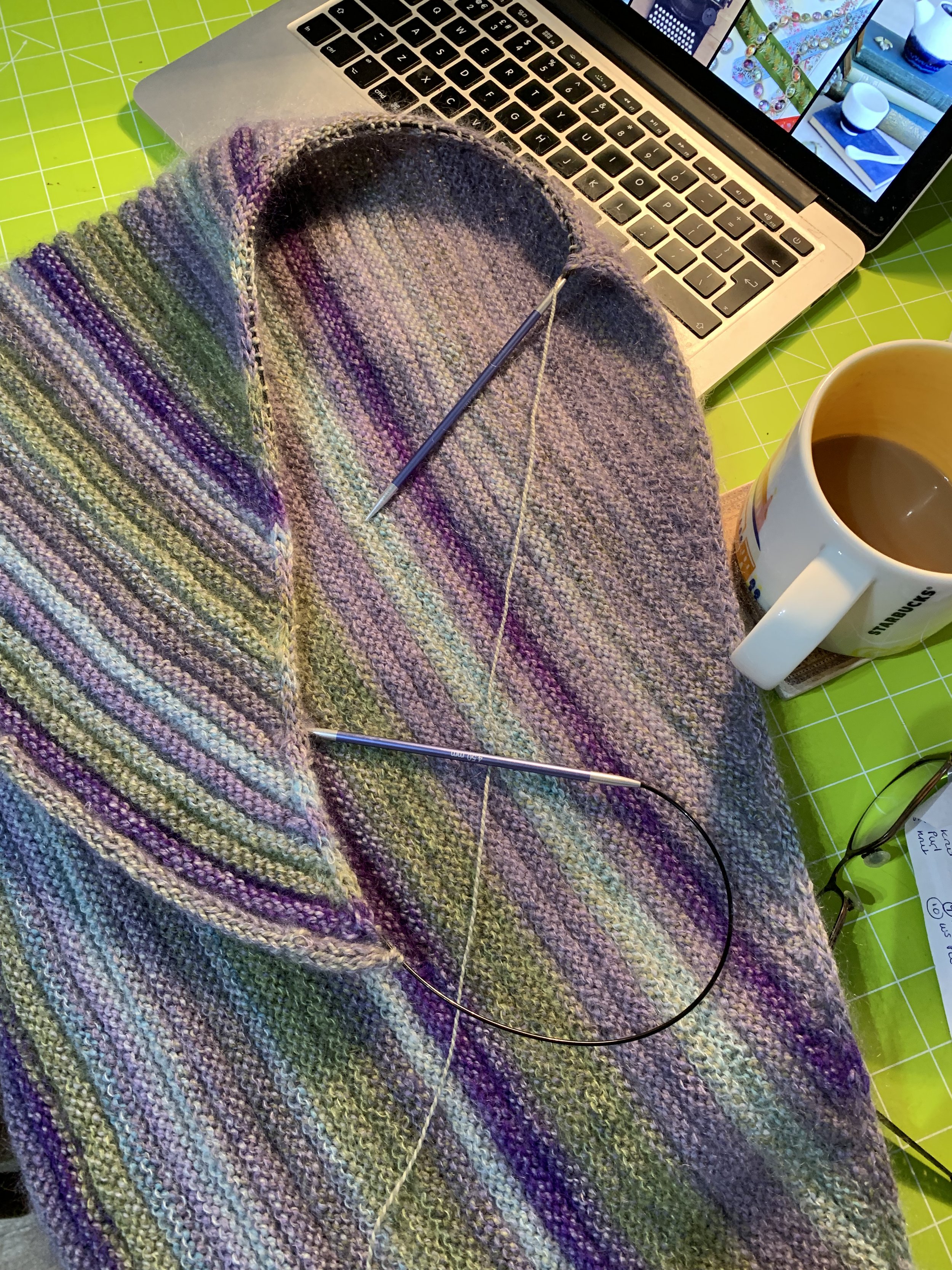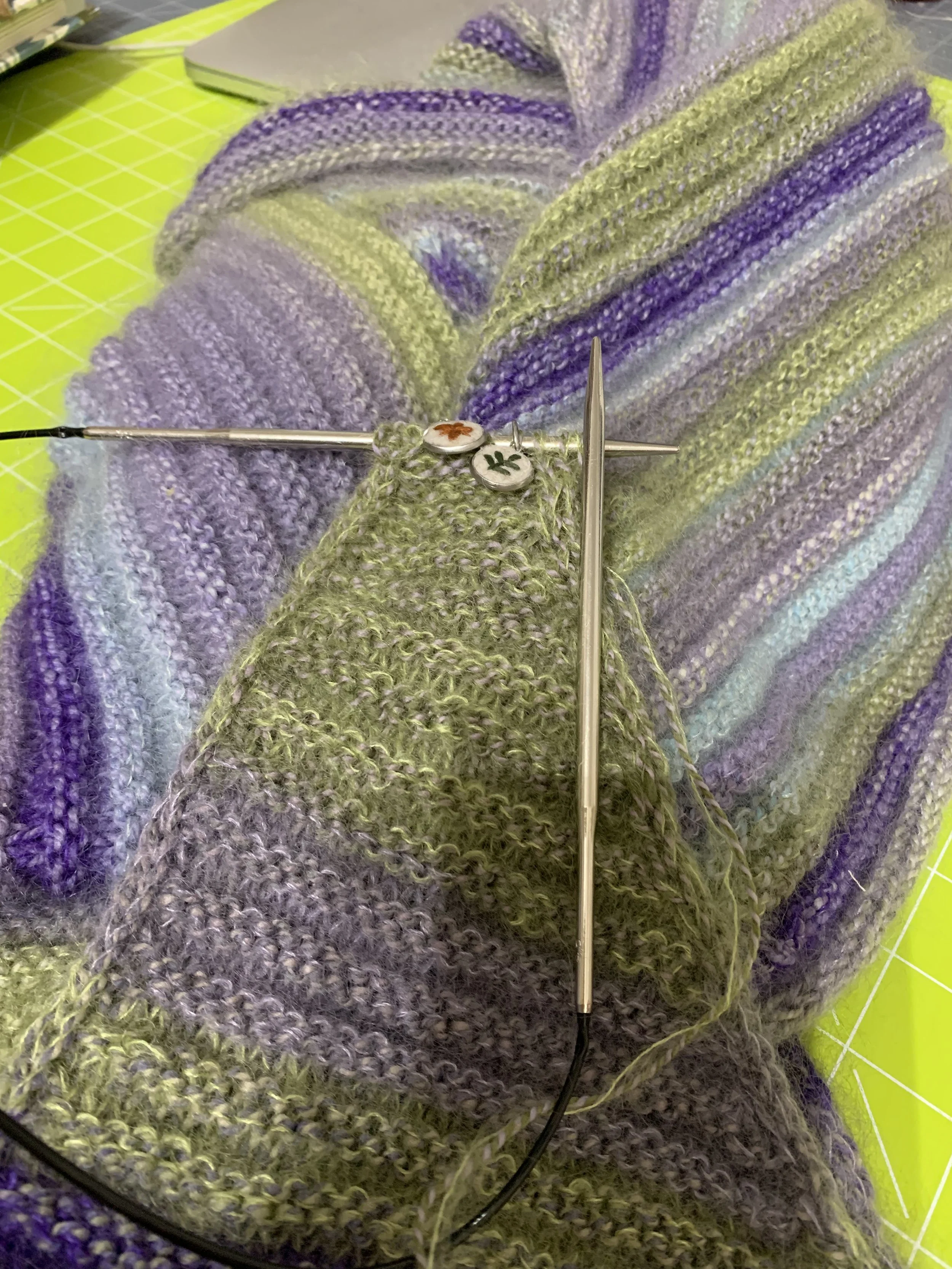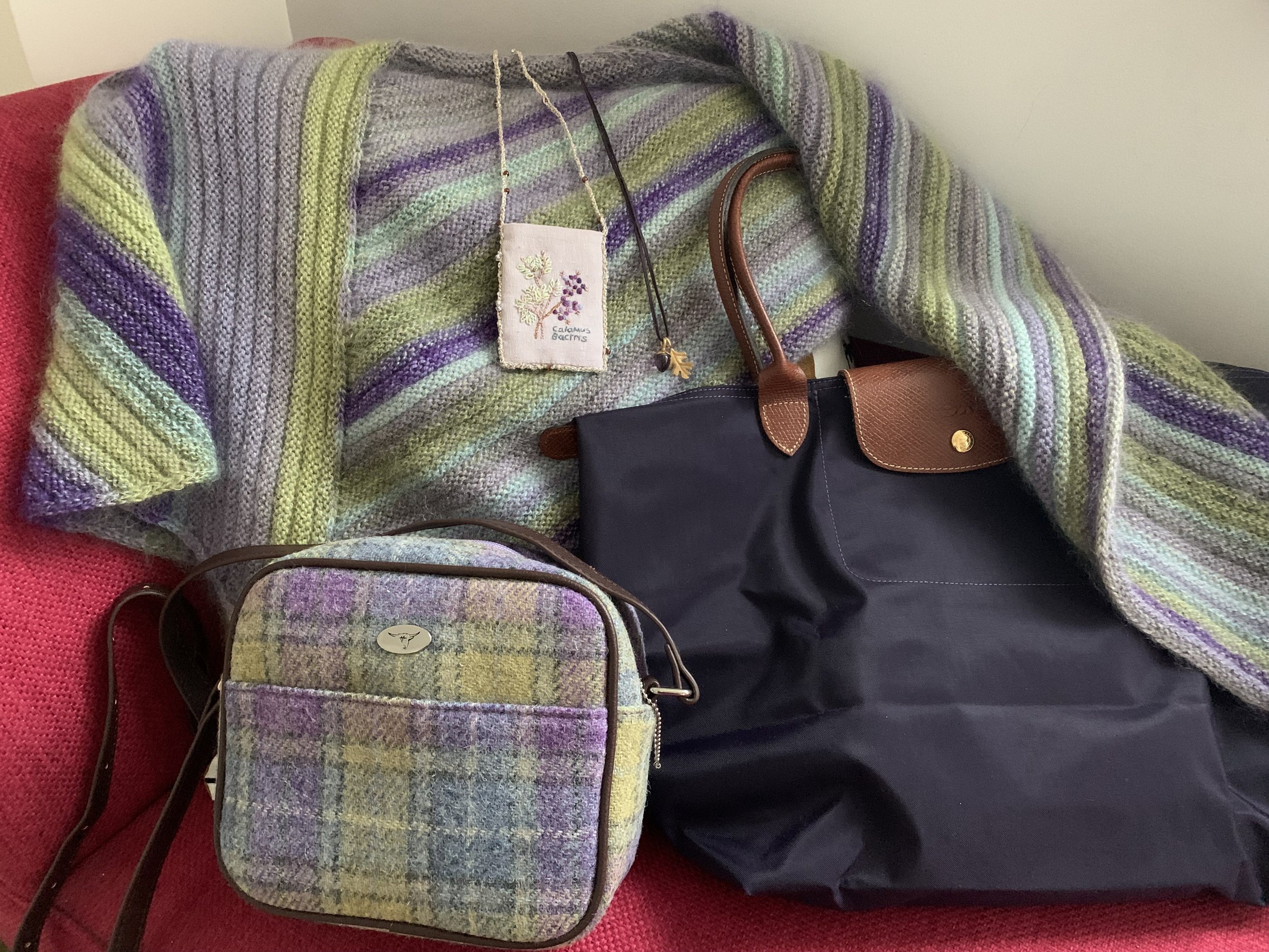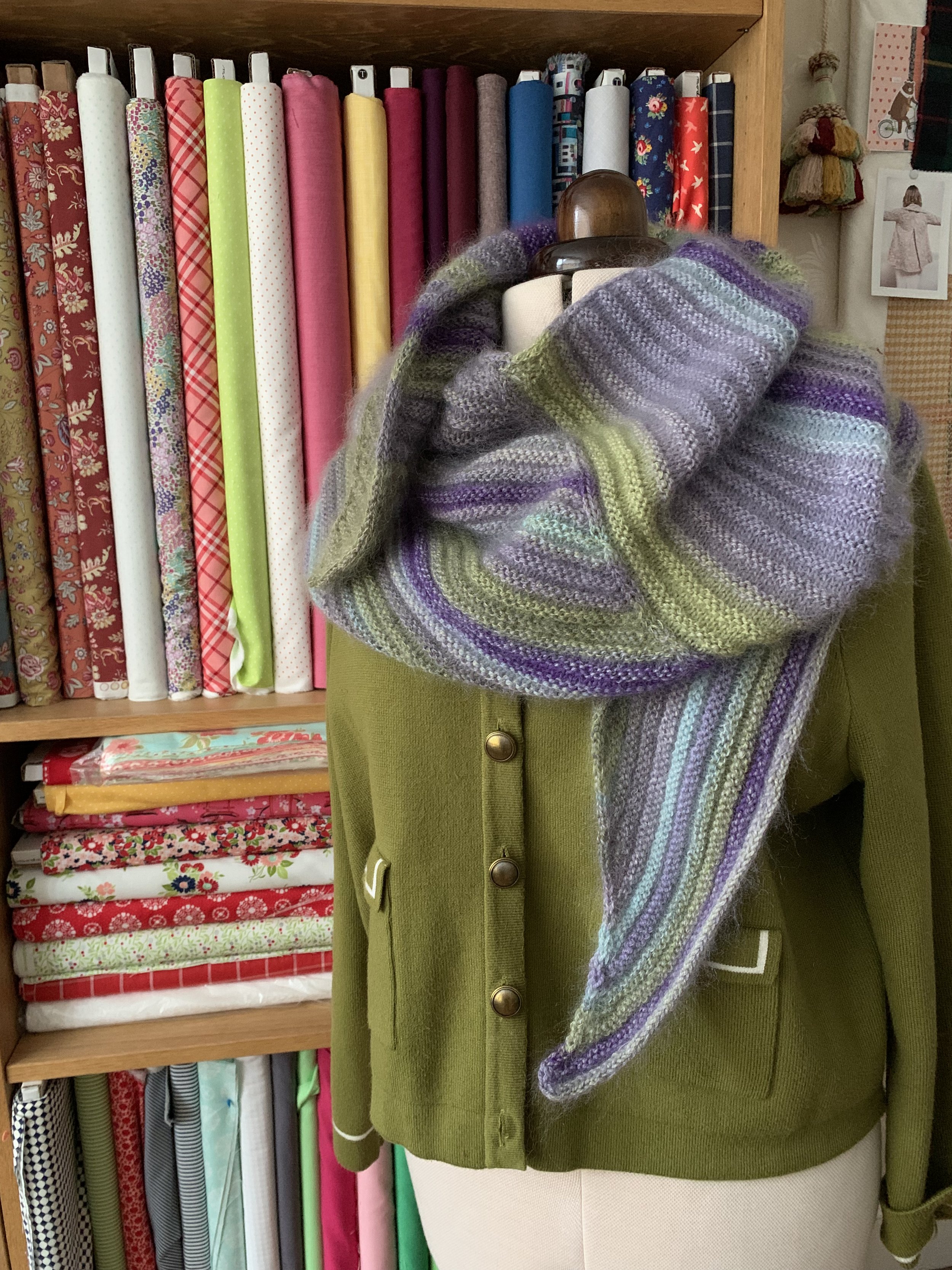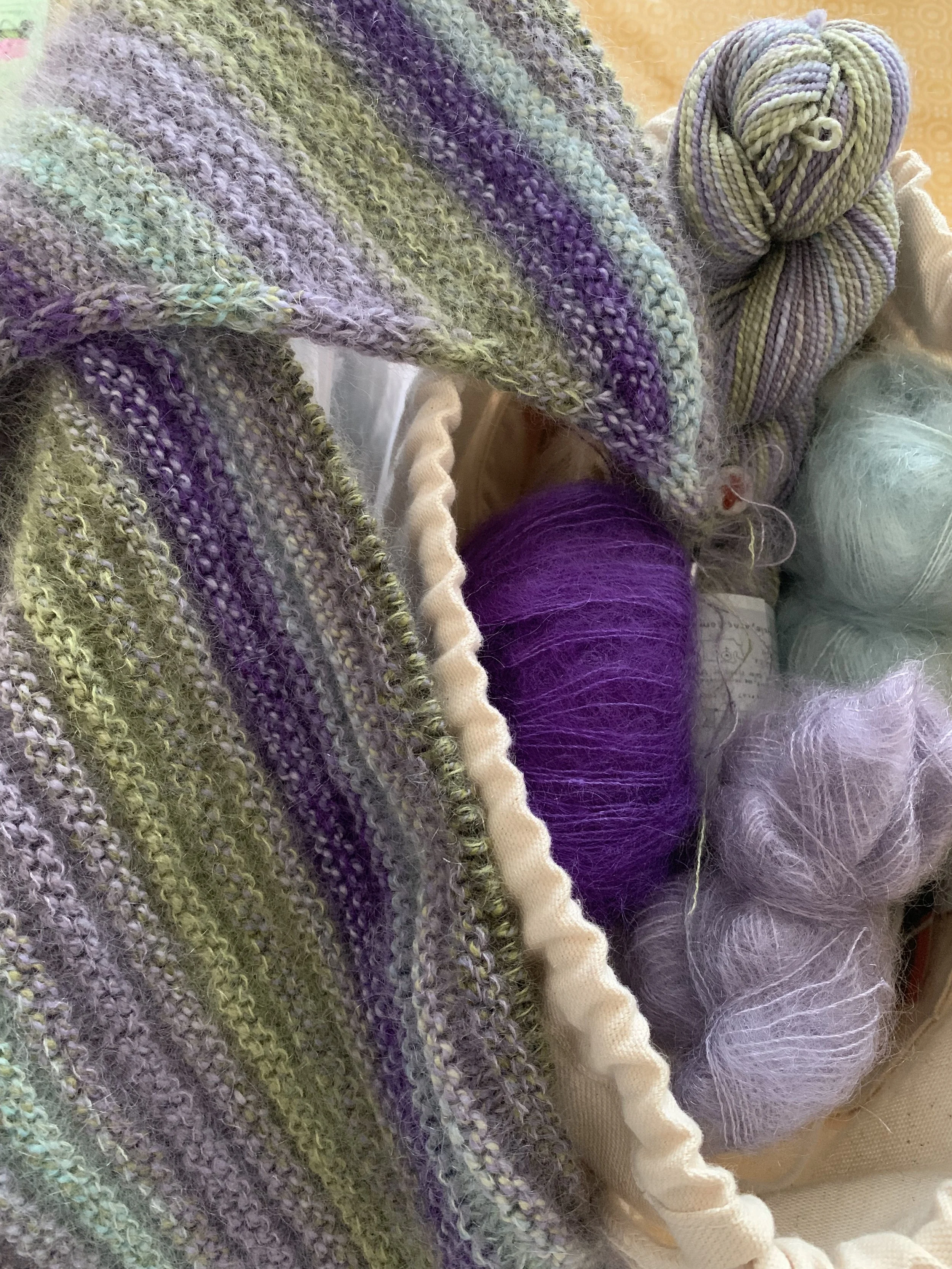 For sure, I didn’t buy all the yarn to begin with. Having dallied on the choice of colour way for ages, in the end, I went with ‘Overboard’ which is lilac and green and violet and aqua. I bought the yarn from Loop in London (most delicious store ever!) but when it arrived I was a little concerned that it was maybe a bit dull, but with the lilac silk mohair to enrich it, I thought I would see how it went. There are a fantastic number of colour ways available and it is not an easy choice but mine was guided by the a couple of things. Firstly I had a bag that I wasn’t using much, but is perfect for travelling that is a deep purple colour and I also had some other accessories and a mossy green knitted jacket, that needed a shawl and finally, it was a chance to experiment with a new colour way that is very pretty. Purple and green are very lovely together.