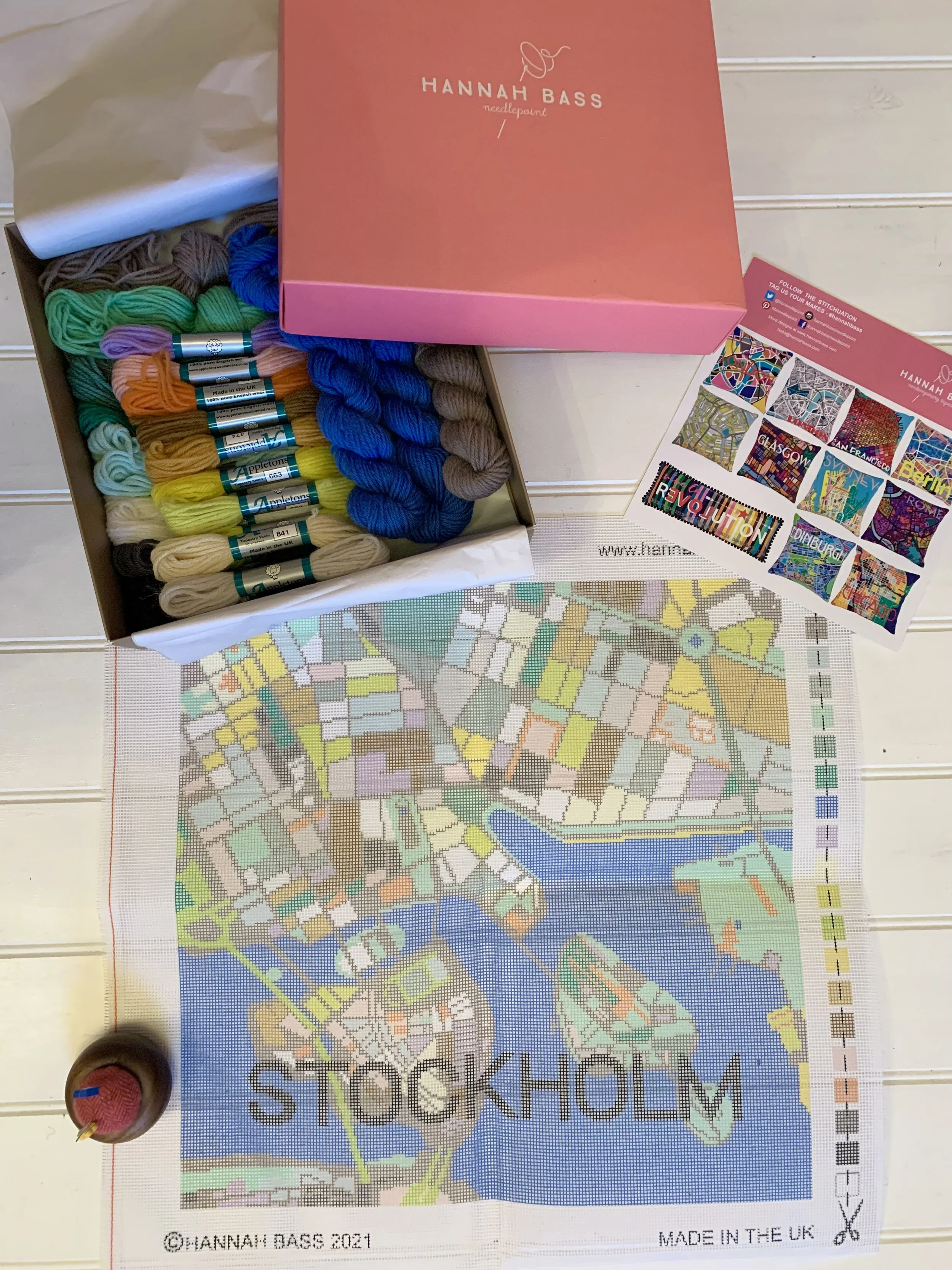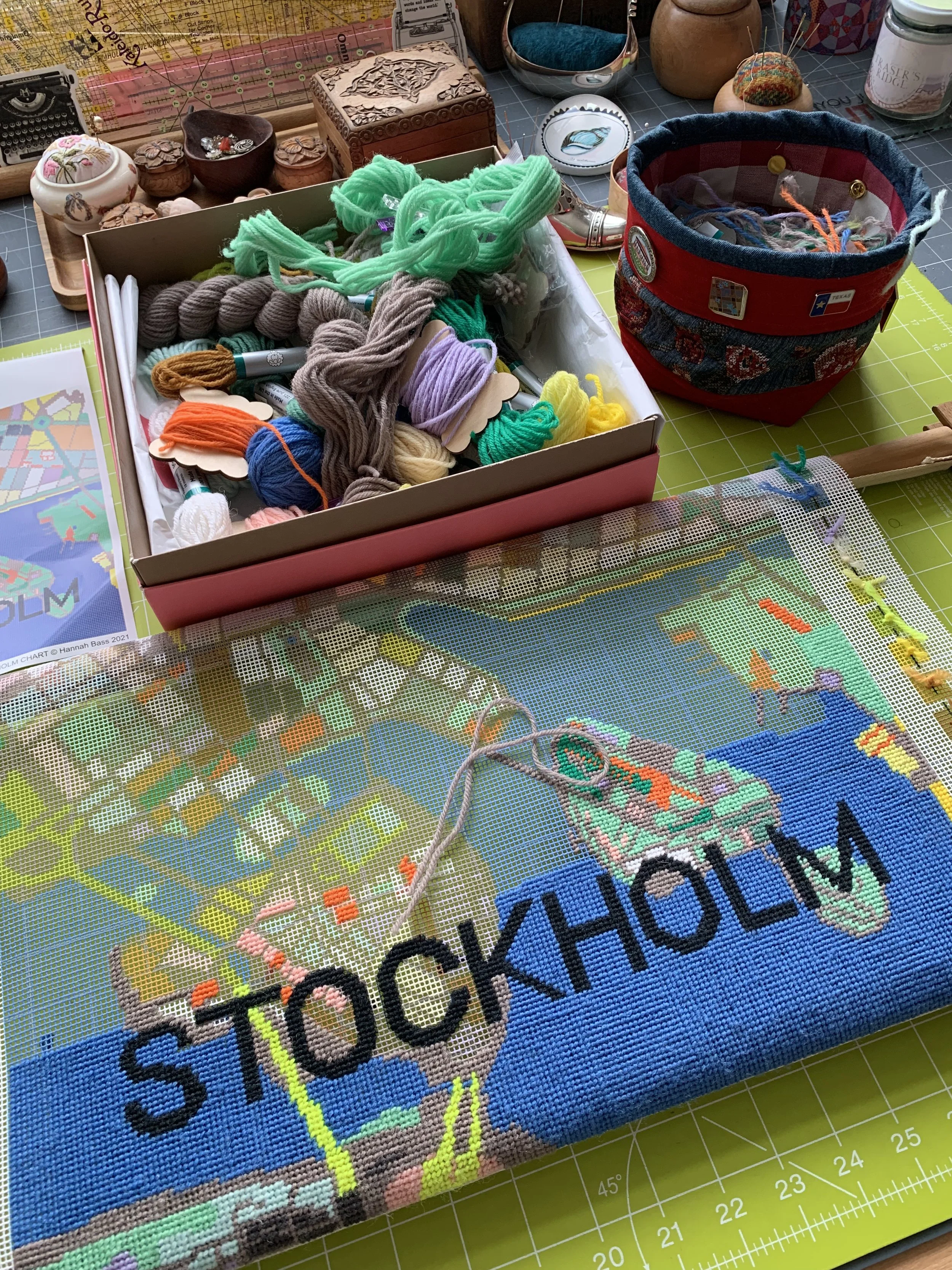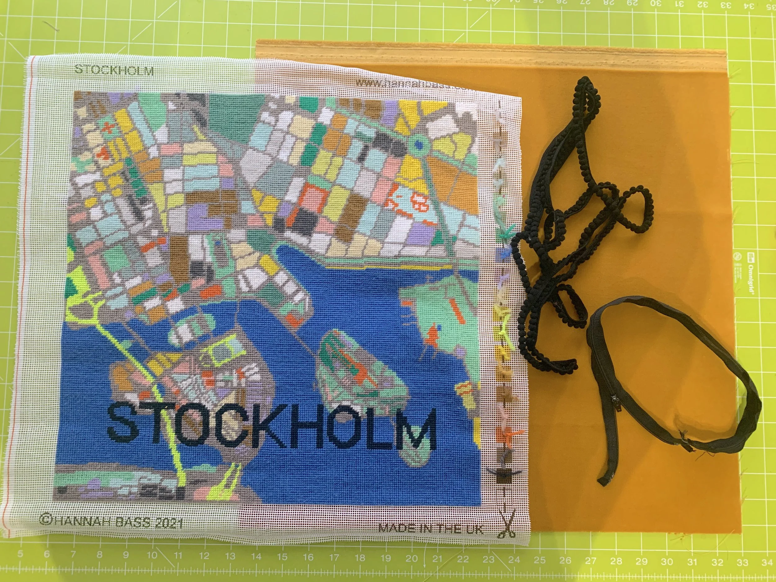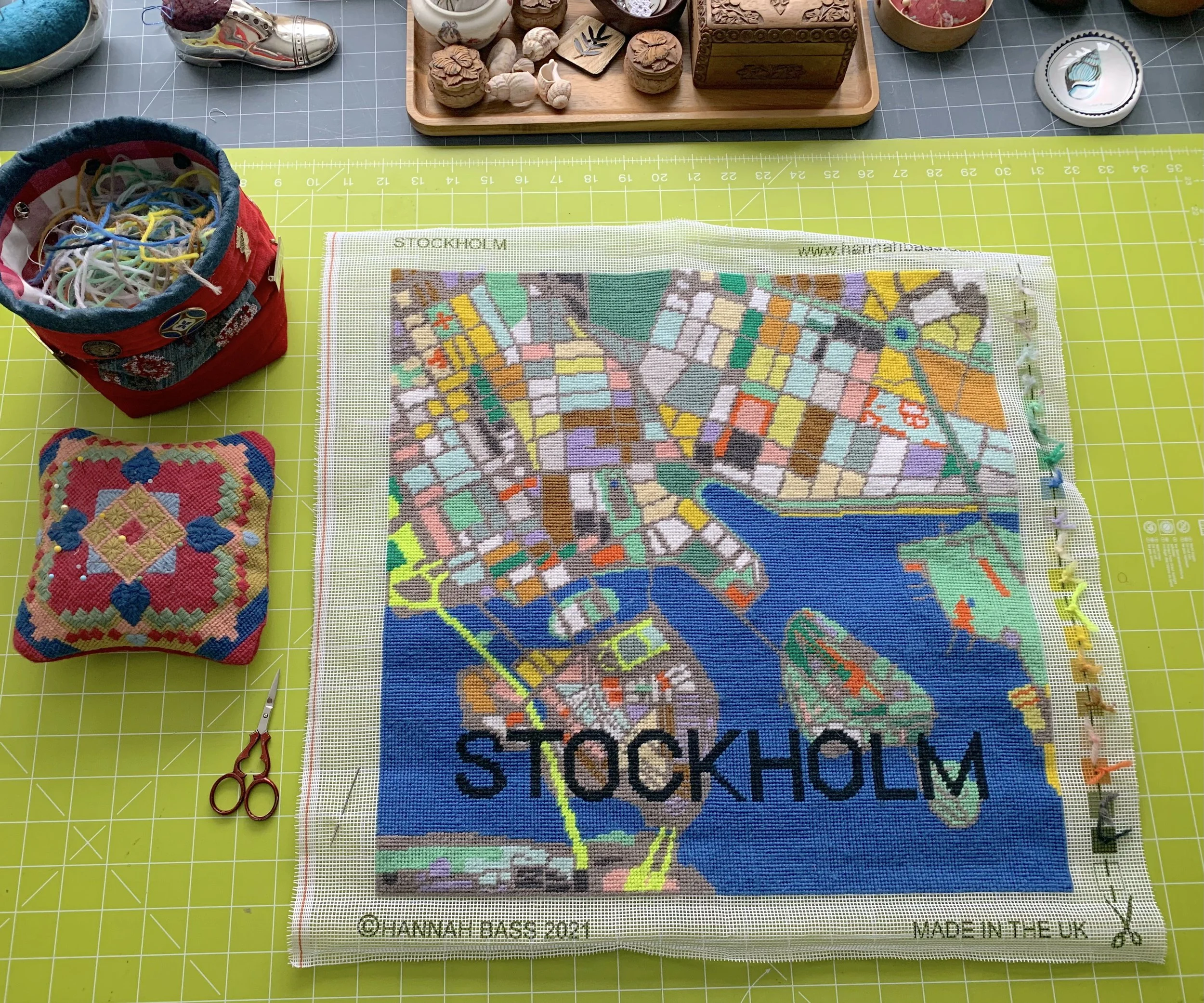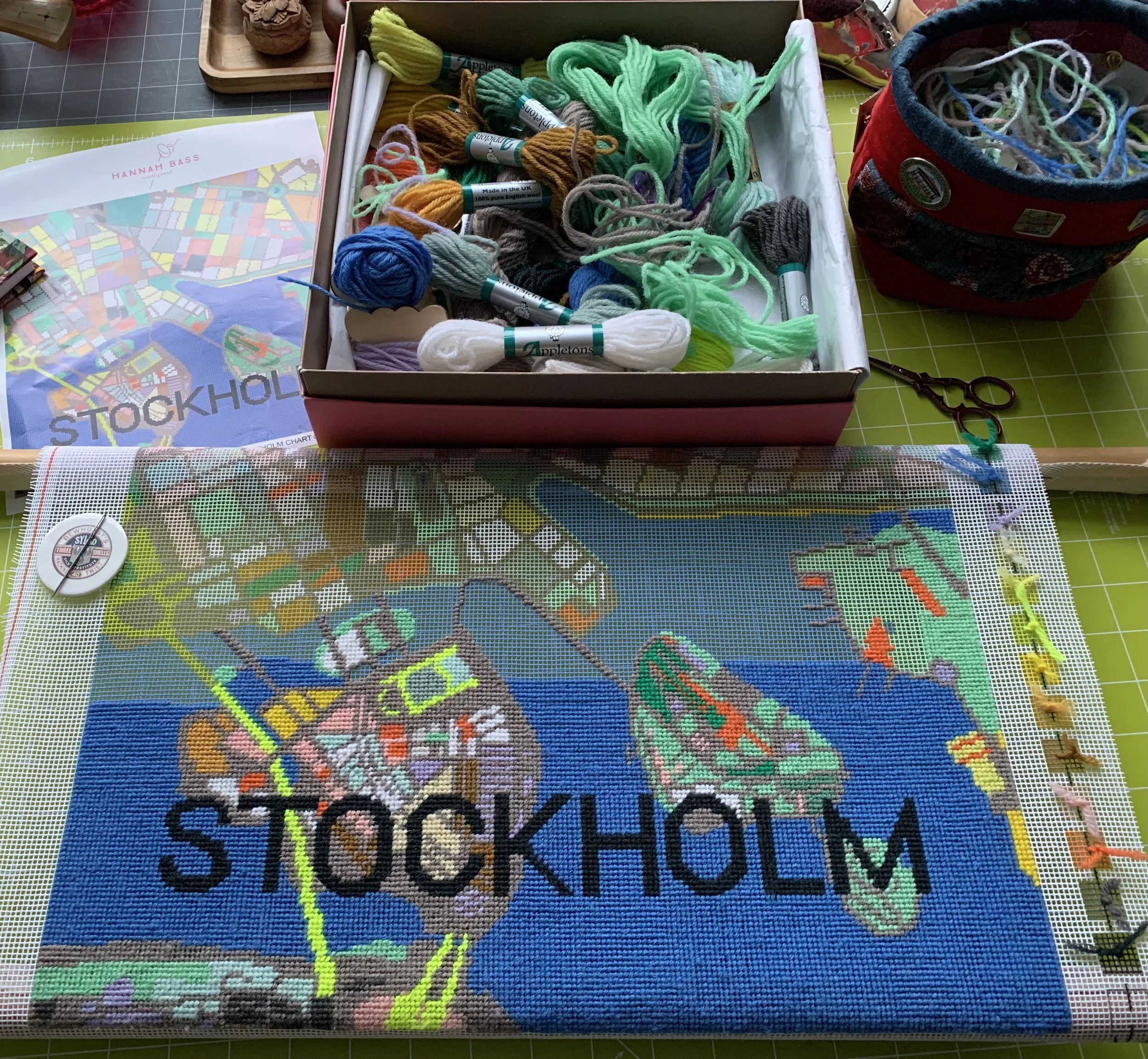 A couple of years ago, my daughter gave me this beautiful kit from Hannah Bass for Christmas. I was thrilled with it, as we had lived in Stockholm for 3 years before returning to England and it was a great way to add a little Scandi flavour into our home. At the time I was in the middle of another needlepoint project, so it duly lined up in the queue in my sewing room. In the intervening time, we moved house and everything was up in the air (or rather in storage) for months and months and finally we landed here in Kent in August of last year. It was chaos, downsizing and we were overwhelmed with boxes and unpacking and endless decisions about what to do with stuff and hardly any sewing got done in the whole of 2025. Now I am back in business in my sewing room, but it is a smaller space than I had before and the need to sort things out was important. I can tell you that I uncovered quite a few things that I thought had long been lost and it has been a great exercise in being organised and prioritising things. This kit was top of my list.