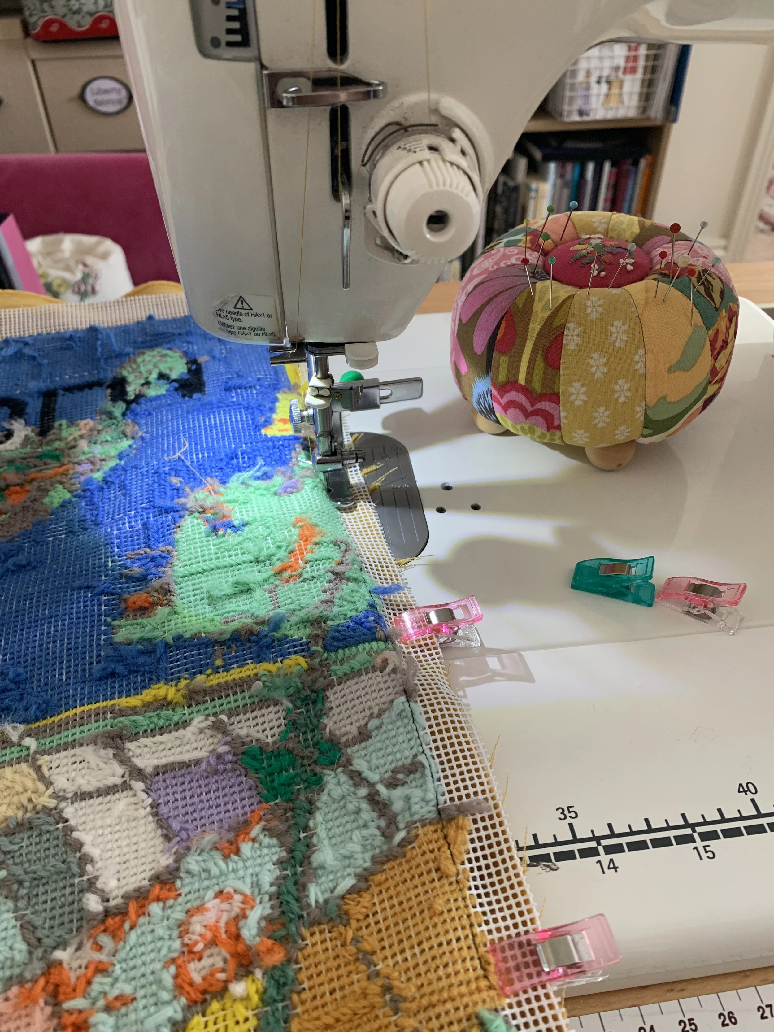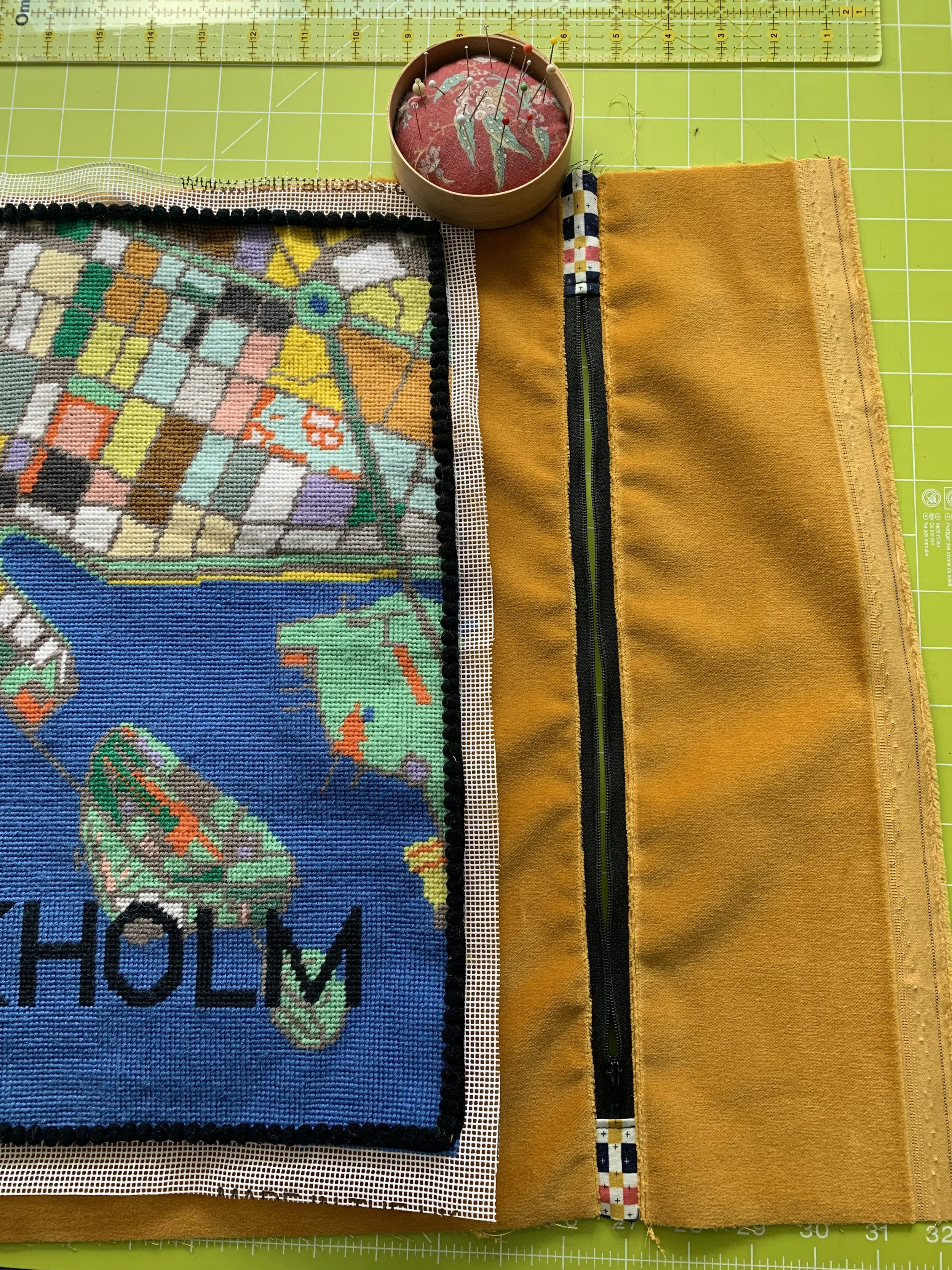 As I had the narrow pompom edging I decided to stitch that on first. It was a bit tricky but I used a zipper foot on my machine and an awl to gradually hold down the flat edge of the trim, a little at a time. I crawled along with the machine, but I could make sure that it was on the edge of the needlepoint. The zip went in to the backing around 3 inches up from the bottom and although, I hate working with velvet, it was straight forward enough.